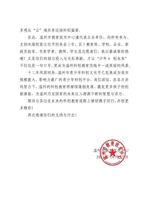 温州市第十二届青少年科创文化节致我校的一封感谢信