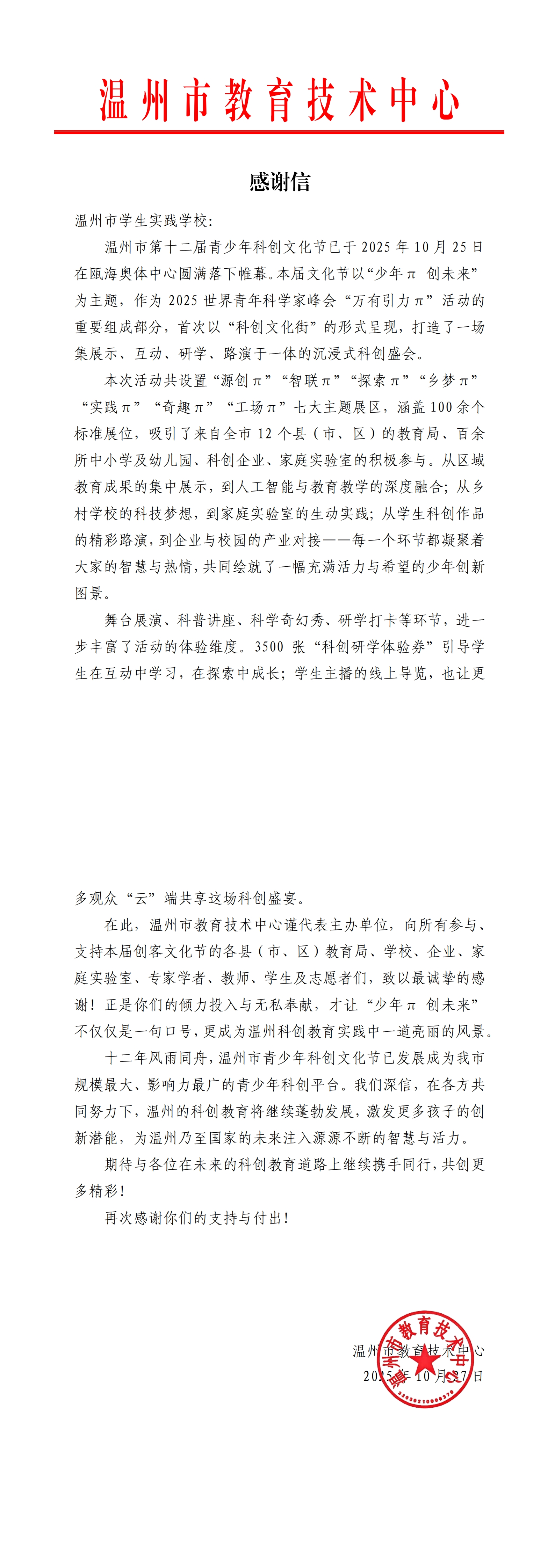 温州市第十二届青少年科创文化节致我校的一封感谢信