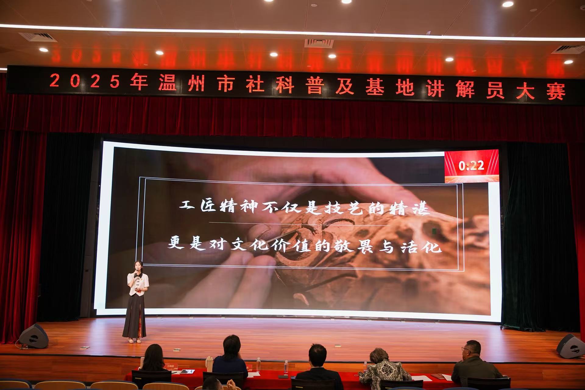 在2025年温州市社科普及讲解大赛中,“岷岗讲坛”骨干成员叶青同志以《识木·赏艺·传薪——黄杨木雕匠心之旅》为题,结合学校温州工艺文化馆,讲述了叶家三代人对于黄杨木雕的传承,从叶润周的精益求精、到叶萌春的守正创新、再到叶小鹏的跨界突破,三代人用行动展现着习总书记强调的工匠精神。登上市级舞台,既是教师个人专业素养的体现,更是我校创新推进“党建+教研”融合机制建设成效的生动诠释。